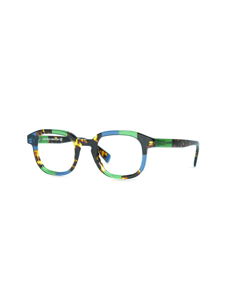 l nome della collezione è rappresentativo del concetto di incollaggio, specialità messa a punto da TRISOTTICA in molti anni di esperienza. Apparentemente è una semplice sequenza di colori, di fatto comporta una preparazione per nulla scontata o casuale delle tavolette di acetato da cui si ricavano il frontale e le aste. I tre colori degli inserti, infatti, vengono predisposti con' un'alternanza di tonalità studiata per suggerire l'effetto del mosaico. La caratteristica predominante è il colore che diventa esclusivo in ogni sua versione. È un applicazione originale che dà vita a modelli sottili con poca consistenza di volumi dove dove sarebbe impossibile ottenere efficaci attraverso incollaggi complessi. Per la semplicità della geometria si è ritenuto che questa interpretazione di incollaggio fosse adatta anche ai modelli maschili, rappresentati in alcune versioni della collezione.